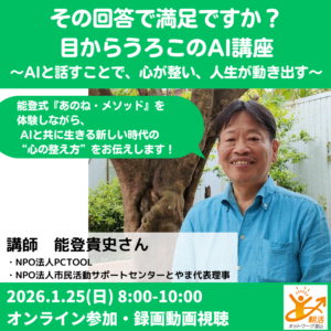 その回答で満足ですか?目からうろこのAI講座 ~AIと話すことで、心が整い、人生が動き出す~ 日時 2026-01-25 08:00 ~09:30 (07:50受付開始) 会場 オンライン(Zoom)/録画動画視聴 参加費 2000円 講師 NPO法人PCTOOL 能登貴史 さん