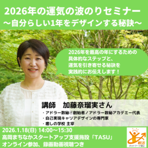 2026年の運気の波のりセミナー~自分らしい1年をデザインする秘訣~ 日時 2026-01-18 14:00 ~15:30 (13:45受付開始) 会場 会場:高岡まちなかスタートアップ支援施設「TASU」/オンライン参加/録画動画視聴 参加費 2000円 講師 アドラー数秘創始者/アドラー数秘アカデミー代表 加藤奈瑠実 さん