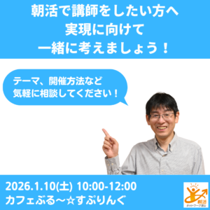朝活で講師をしたい方へ 実現に向けて一緒に考えましょう! 日時 2026-01-10 10:00 ~12:00 (10:00受付開始) 会場 多目的カフェ ぶる~すぷりんぐ(富山市東田地方2丁目2-2) 参加費 0円