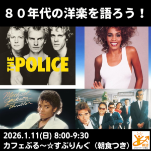80年代の洋楽を語ろう! 日時 2026-01-11 08:00 ~09:30 (07:45受付開始) 会場 多目的カフェ ぶる~すぷりんぐ(富山市東田地方2丁目2-2) 参加費 1000円 申込締切 2026-01-10 20:00
