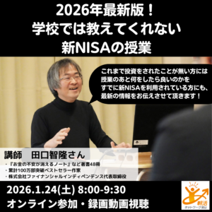 2026年最新版!学校では教えてくれない新NISAの授業 日時 2026-01-24 08:00 ~09:30 (07:50受付開始) 会場 オンライン開催(Zoom) 参加費 3000円 講師 株式会社ファイナンシャルインディペンデンス 代表取締役 田口智隆 さん