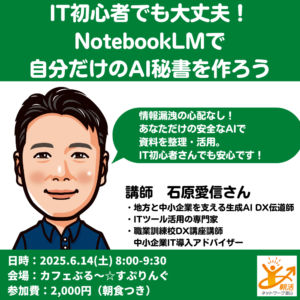 IT初心者でも大丈夫! NotebookLMで自分だけのAI秘書を作ろう 日時 2025-06-14 08:00 ~09:30 (07:45受付開始) 会場 多目的カフェ ぶる~すぷりんぐ(富山市東田地方町2丁目2ー2) 参加費 2000円 講師 地方と中小企業を支える生成AI DX伝道師 石原愛信 さん 申込締切 2025-06-13 20:00