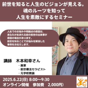 前世を知ると人生のビジョンが見える。魂のルーツを知って人生を素敵にするセミナー 日時 2025-06-22 08:00 ~09:30 (07:50受付開始) 会場 オンライン開催(Zoom) 参加費 2000円 講師 前世療法セラピスト 木本和幸 さん
