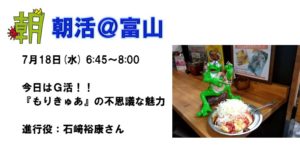 【朝活】7月18日(水) 今日はG活!『もりきゅあ』の不思議な魅力 日時 2018-07-18 06:45 ~08:00 (06:30受付開始) 会場 ゴールドカレー富山豊田店(富山市豊田町1丁目12-21) 参加費 600円 講師 石﨑裕康 さん