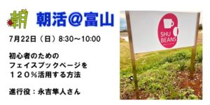【朝活】7月22日(日) フェイスブックページを120%活用する方法 日時 2018-07-22 08:15 ~10:00 (08:00受付開始) 会場 カフェ・シュービーンズ(滑川市東福寺野98) 参加費 1000円 講師 朝活@富山 永吉隼人 さん